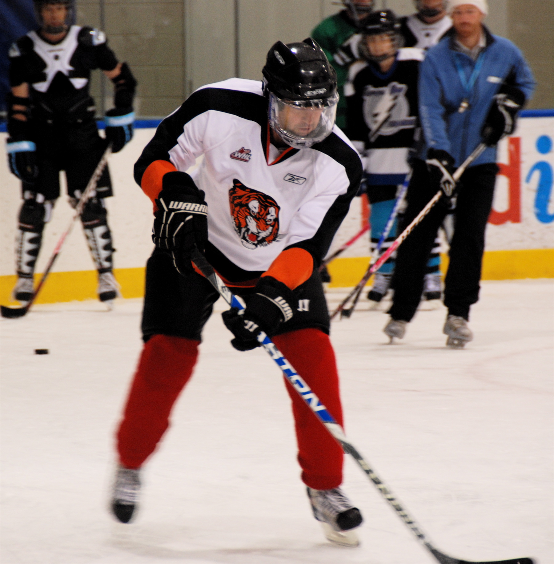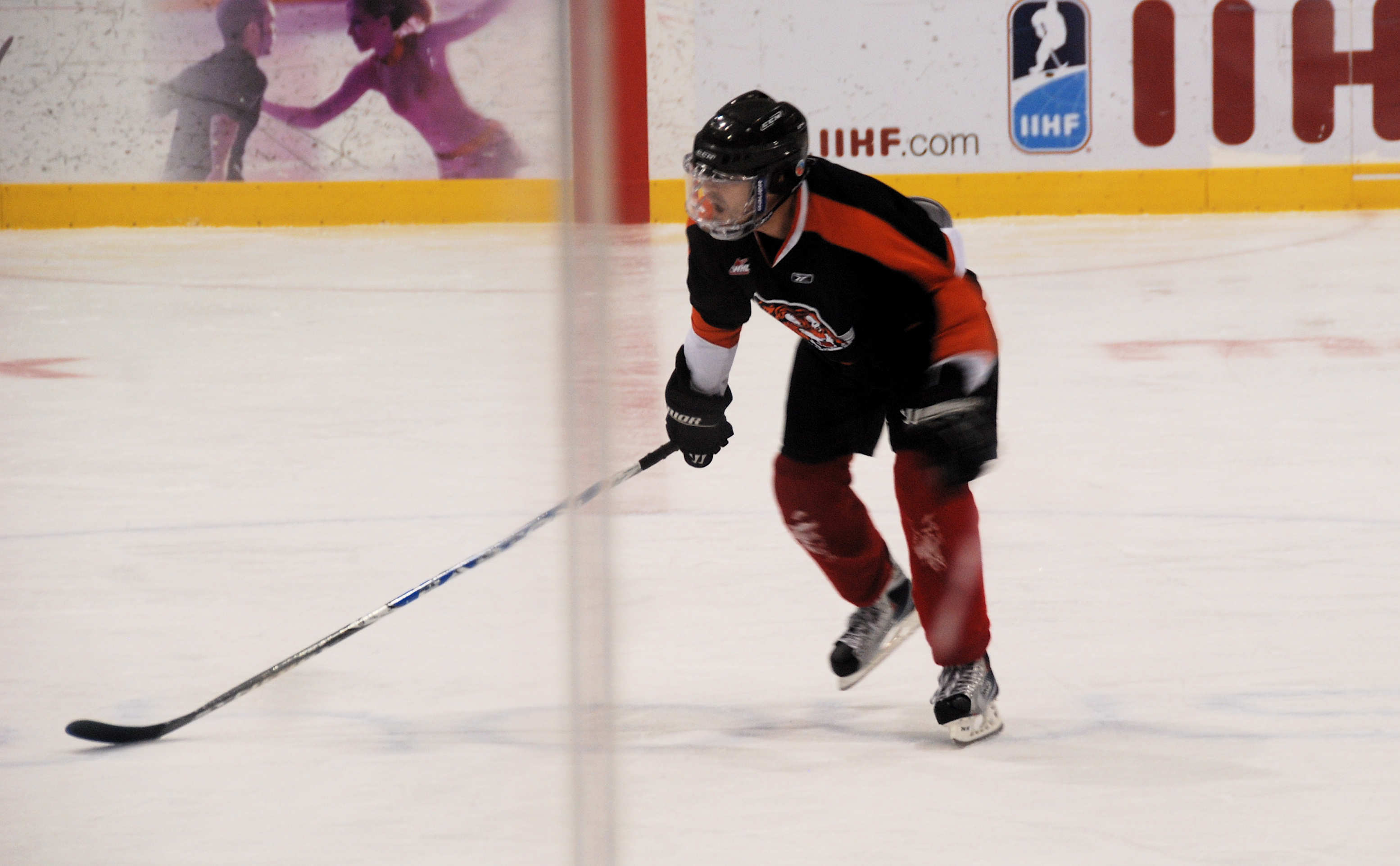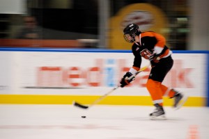 Over time, the session sorts itself out so that most of the newbies wear themselves out and leave the ice, while a bunch of hardcore hockey dawgs are at one end, enjoying an actual goalie in net, deflecting their shots. And a few of us are at the other goal, with the standard “fake” goalie – let’s call him Otto the auto-goalie for Flying High fans– protecting the net.