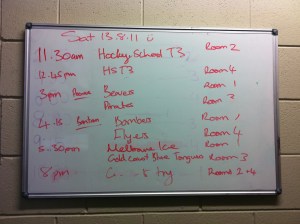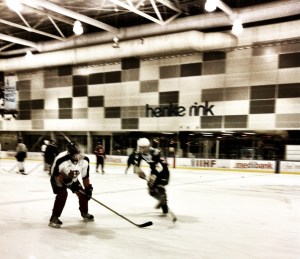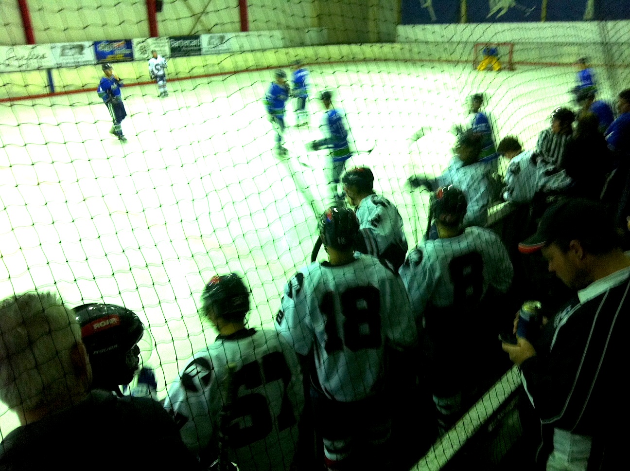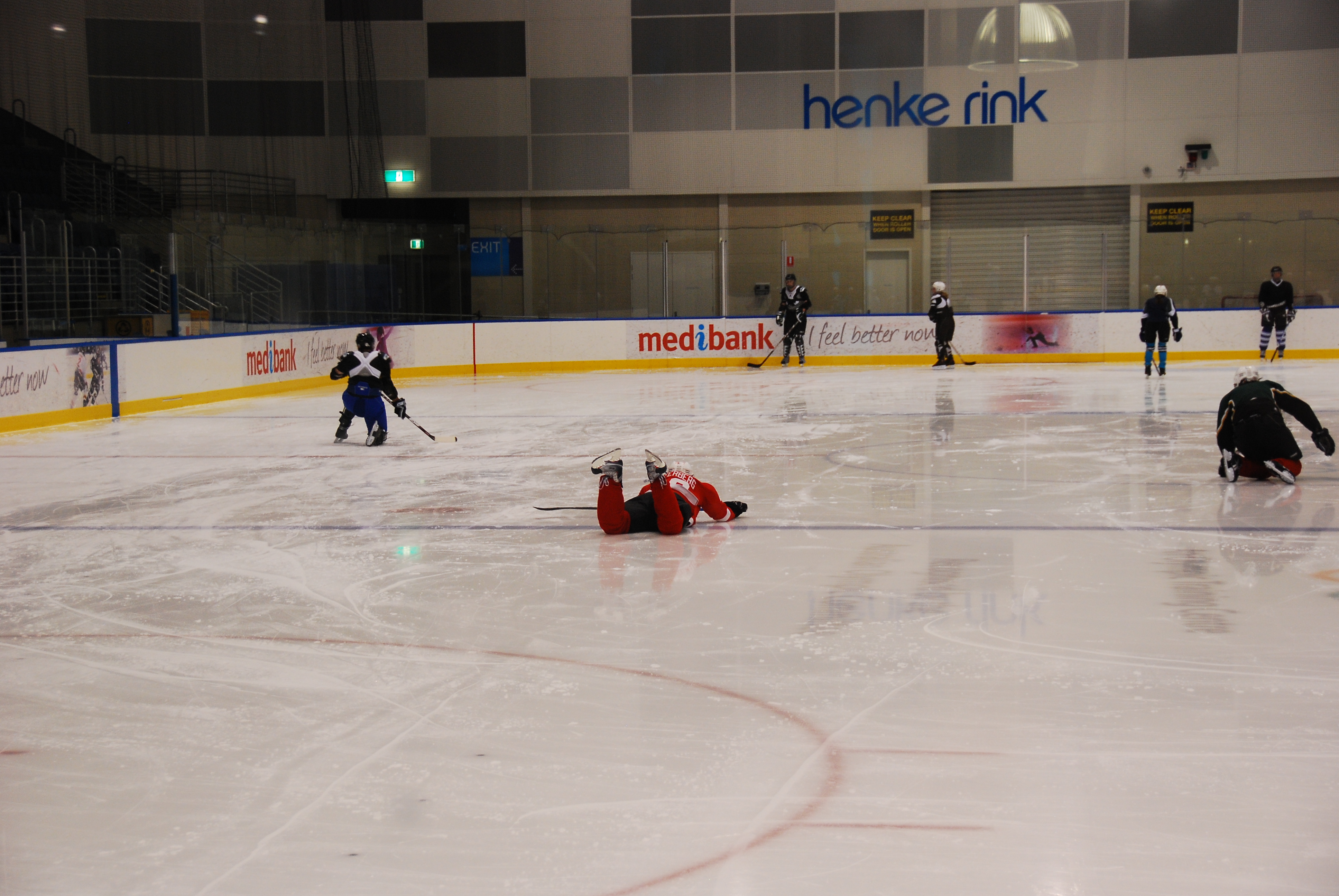 Last night’s session saw us trying to master the following skill: skate as fast as you could to the boards, spin and hit the wall with your arse, while the puck came screeching along the boards from Lliam’s stick behind the goals, like something out of Rollerball.