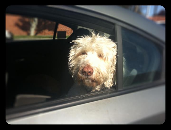 Fly Dog The Magnificent, as she spends more of her time these days, post injury: being driven around.