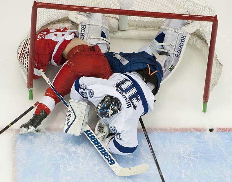 Darren Helm shows standard Red Wing desperation, crashing the Tampa Bay net on Sunday. The Wings got the points. Pic: Detroit News