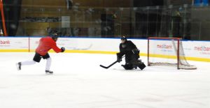 Twenty minutes, some awkward positions and some funny responses as people saw me in goalie gear later, I was stumbling onto the ice. Nicko doing his best paparazzi impersonation to capture the moment means I should have some momentos. But basically I was shitting myself. Suddenly everybody had a Chara-like shot. Oh, and great … down the other end was Coach Dave who in his spare time happens to be a Prem A goalie. Great.
